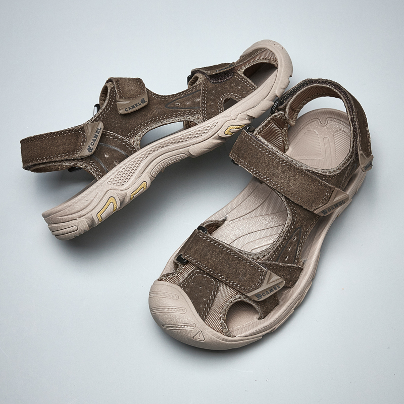 骆驼服饰旗舰店男鞋新款春夏休闲凉鞋包头凉鞋男士户外鞋魔术贴防滑沙滩鞋猪皮鞋面 百搭时尚 魔术贴带